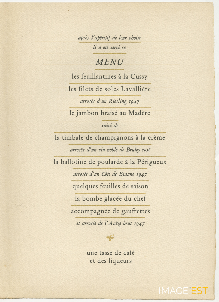 Menu du 60e anniversaire de l'ICN-ENSIC 1890-1950 (Institut chimique de Nancy - École nationale supérieure des industries chimiques de Nancy) à Nancy (Meurthe-et-Moselle. Ce menu a été imprimé sur les presses de l'imprimerie " La Ruche " à Paris, d'après une gravure sur bois de Gilbert Poilliot, " vélin pur fil des papeteries Johannot ". Il s'agit de l'exemplaire n°210 (cf. 4e de couverture). Pour fêter le 60e anniversaire de cette institution, devenue en 1936, École supérieure des industries chimiques de Nancy, " les anciens élèves ont réuni le samedi 9 décembre 1950, dans les salons de l'hôtel de ville de Nancy, sous la présidence de M. le ministre de l'Éducation nationale, les membres du comité d'honneur, le président dela fondation, qui ont bien voulu se joindre à leur président et aux plus assidus des anciens ".