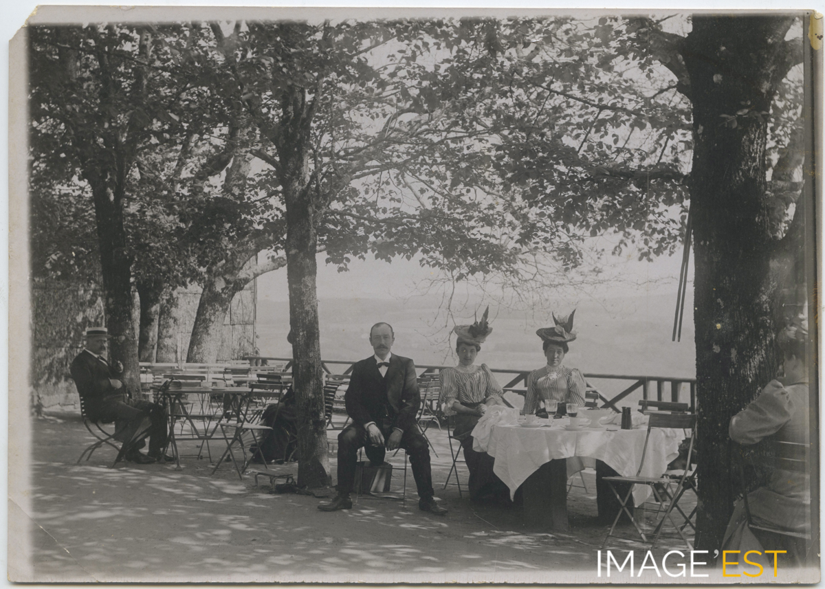 Groupe de personnes attablées probablement au restaurant de la Feuillée-Dorothé surplombant Le Val-d'Ajol (Vosges). À remarquer au sol, la sacoche du photographe et un appareil. Cette photographie est extraite d'un album en cuir repoussé comprenant un ensemble de 48 photographies (format 13 x 18 cm), noir et blanc, illustrant les loisirs et la vie d'une famille aisée probablement dans le département des Vosges à la fin du XIXe ou au début du XXe siècle.
