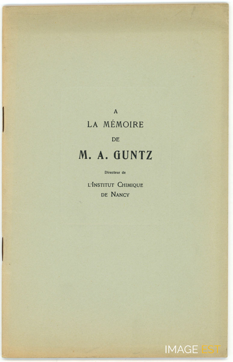 Couverture d'une brochure intitulée " À la Mémoire de M. A. Guntz ", directeur de l'Institut chimique de Nancy. La brochure comprend une reproduction d'un dessin signé V. Prouvé de 1929 représentant A. Guntz. Dans le discours prononcé lors des obsèques, A. Wahl, élève de Guntz, apporte des précisions sur les débuts de l'ICN : " C'est à la rentrée de l'année 1892 que les laboratoires de chimie de la Faculté des Sciences furent transportés dans les nouveaux locaux de la rue Grandville. Les cours se donnaient pour la première fois dans cet Institut chimique ".