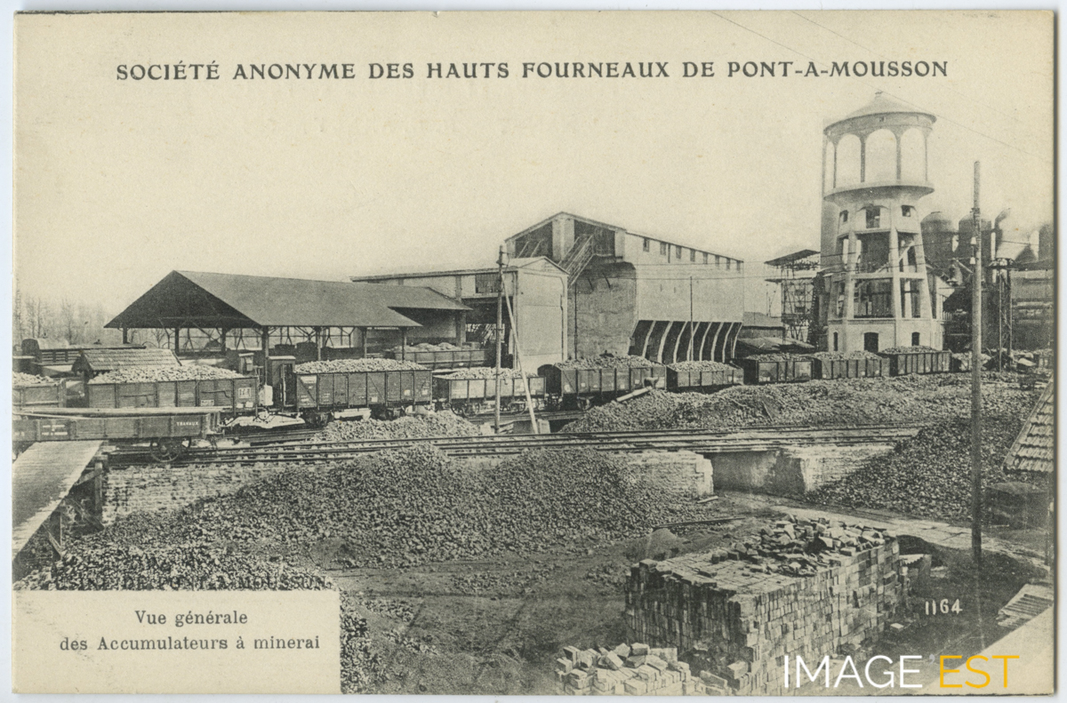 Accumulateurs à minerai de l'usine de Pont-à-Mousson (Meurthe et Moselle). Au verso figure l'adresse : " 13, rue Saint-Léon - Nancy - R.C. Nancy n° 584 ".