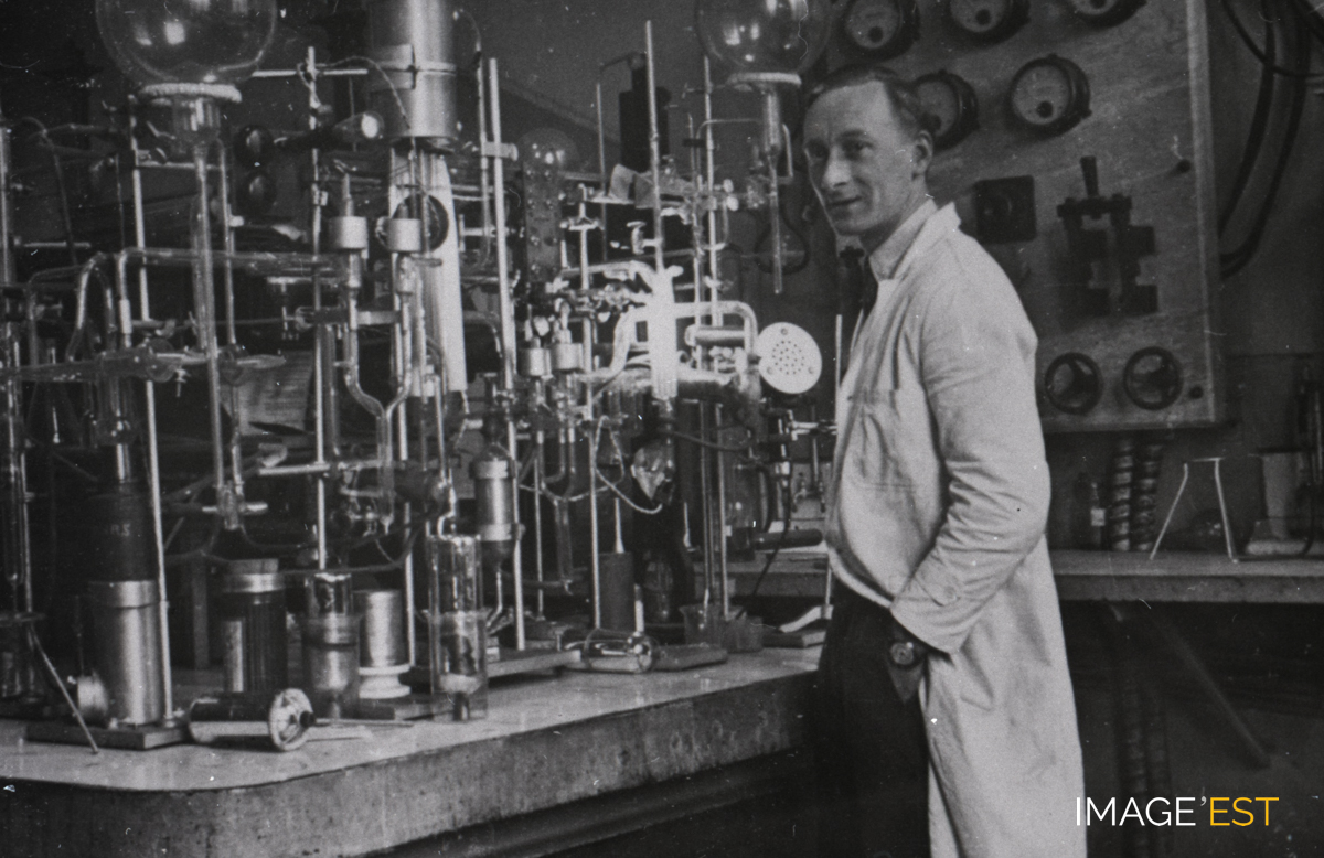 Probablement Aimé Eugène Aubertin (1888-1973) dans un laboratoire de l'École nationale supérieure des industries chimiques (ENSIC) à Nancy (Meurthe-et-Moselle).