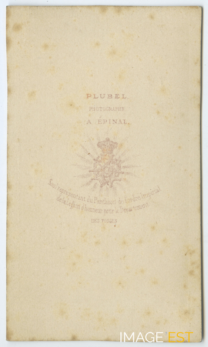 Portrait-carte de visite du photographe Plubel, installé à Épinal (Vosges), auteur d'un portrait de " M. l'abbé Parmentier curé d'Uzemain 1808-1880 ". Une dédicade accompagne la carte : " Seul représentant du Panthéon de l'ordre national de la Légion d'honneur pour le département des Vosges ". Cette photographie est extraite d'un album contenant des portraits de nombreux prêtres ayant exercés dans le département des Vosges entre 1870 et 1910 environ.