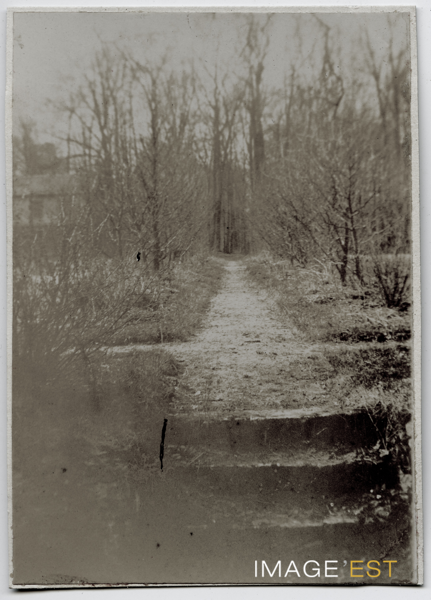 Vue extraite d'un album photographique intitulé " Parc de Ste Marie - Avant sa transformation " illustrant une allée du potager du parc Sainte-Marie à Nancy (Meurthe-et-Moselle) en 1905. Une légende manuscrite en marge de ce cliché indique : " Grande allée du potager ".