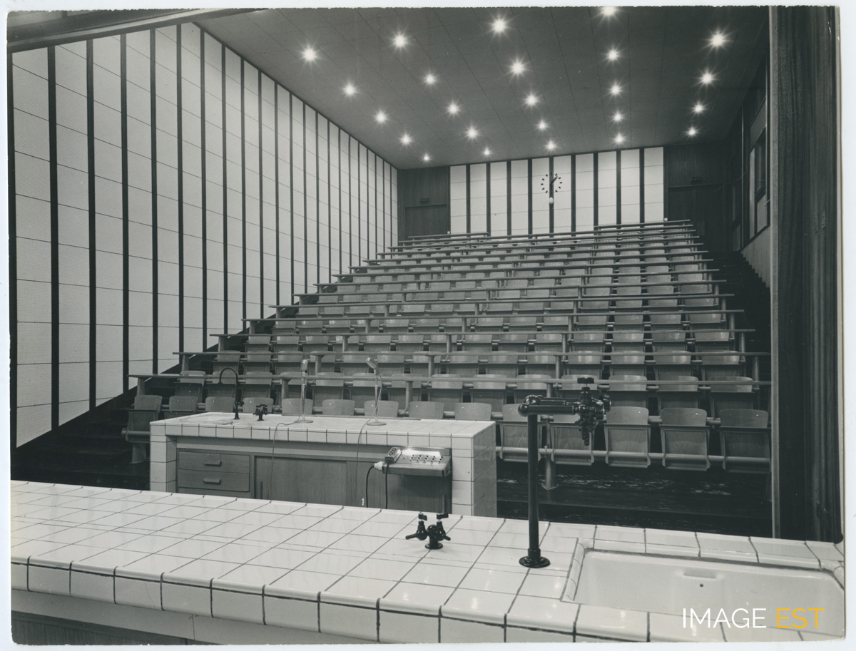 Nouvel amphithéâtre Pierre Donzelot du bâtiment de l'École nationale supérieure des industries chimiques, rue Déglin à Nancy (Meurthe-et-Moselle). Une mention manuscrite au verso précise : " E.N.S.I.C. Bâtiment Déglin. L'amphithéâtre Pierre Donzelot ". Cachet du photographe Charles André (N°24-2951) au verso.