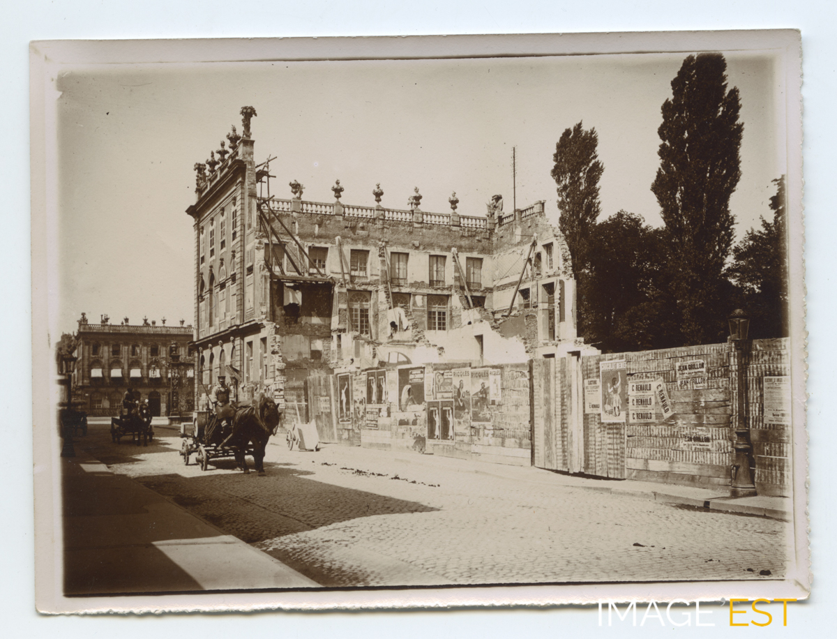 Depuis la rue Sainte-Catherine, vue arrière des façades avant et gauche de l'opéra, avant sa construction à l'emplacement de l'ancien évêché à Nancy (Meurthe-et-Moselle), en juillet 1910. Une mention manuscrite au verso de cette photographie précise : " 180 - juillet 1910 - 46 ".