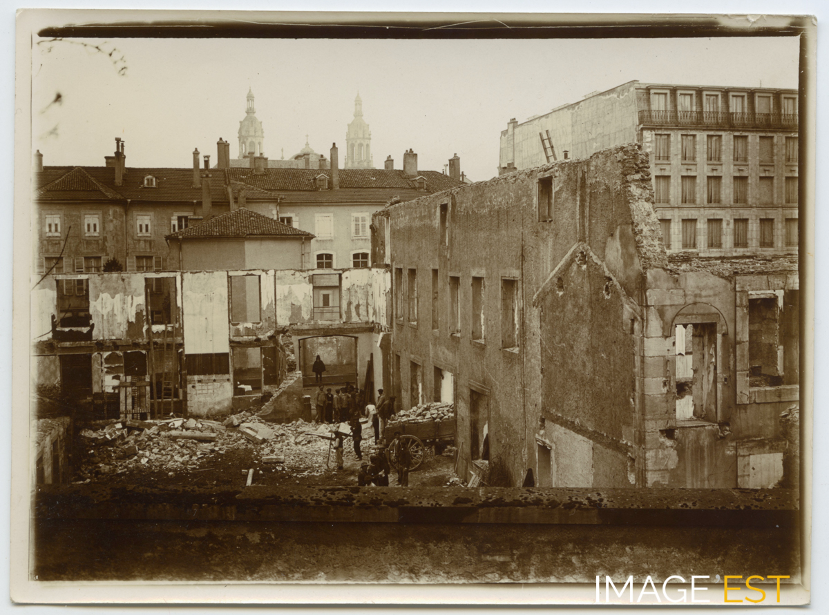 Chantier de démolition de l'ancien évêché situé à l'emplacement de l'actuel Opéra à Nancy (Meurthe-et-Moselle), le 7 avril 1910. Une mention manuscrite au verso de cette photographie précise : " 179 - 7 avril 1910 ". Présence de nombreux ouvriers sur le chantier. À l'arrière-plan, on aperçoit la cathédrale Notre-Dame-de-l'Annonciation.