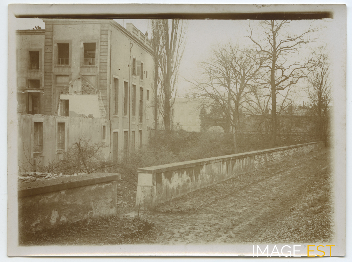 Ancien évêché situé à proximité de la place Stanislas, près de la fontaine Amphitrite à Nancy (Meurthe-et-Moselle), le 7 avril 1910. Une mention manuscrite au verso de cette photographie précise : " 177 - 7 avril 1911 - 33 ".