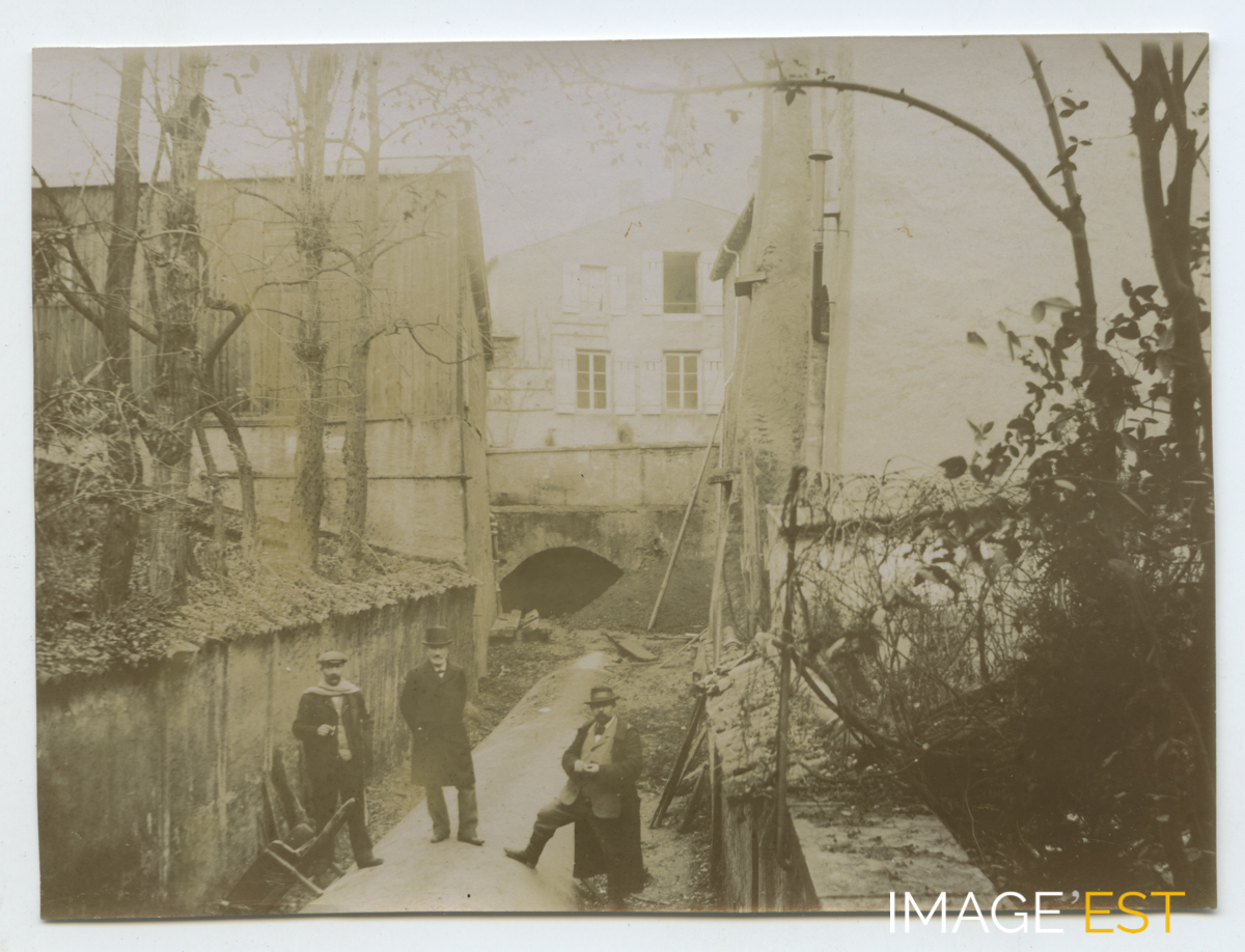 Ancien fossé au milieu d'habitations, près de la rue du Montet à Nancy (Meurthe-et-Moselle), en septembre 1898. Une mention manuscrite au verso de cette photographie précise : " 268 - 9 1898 - 7 - 8 98 ". Présence de trois hommes au premier plan et d'une entrée de souterrain.