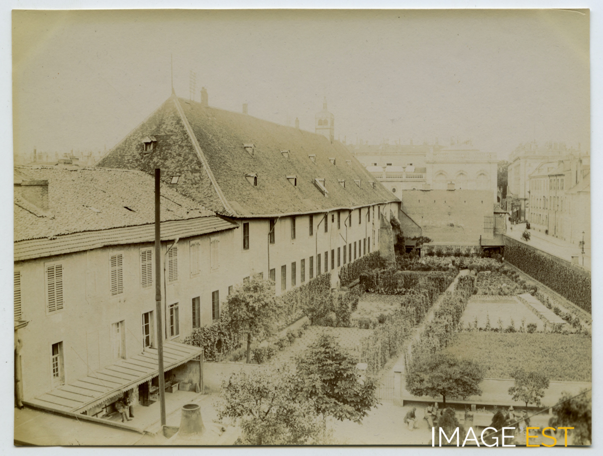 Jardin de la cour de lancien hôpital Saint-Julien derrière l'hôtel de ville et la place Stanislas à Nancy (Meurthe-et-Moselle), le 5 juillet 1898. Une mention manuscrite au verso de cette photographie précise : " 208 - 5 juillet 1898 - Cour de l'Hopital St Julien - Vue d'une maison de la rue St Georges - moyen - violet franc ".