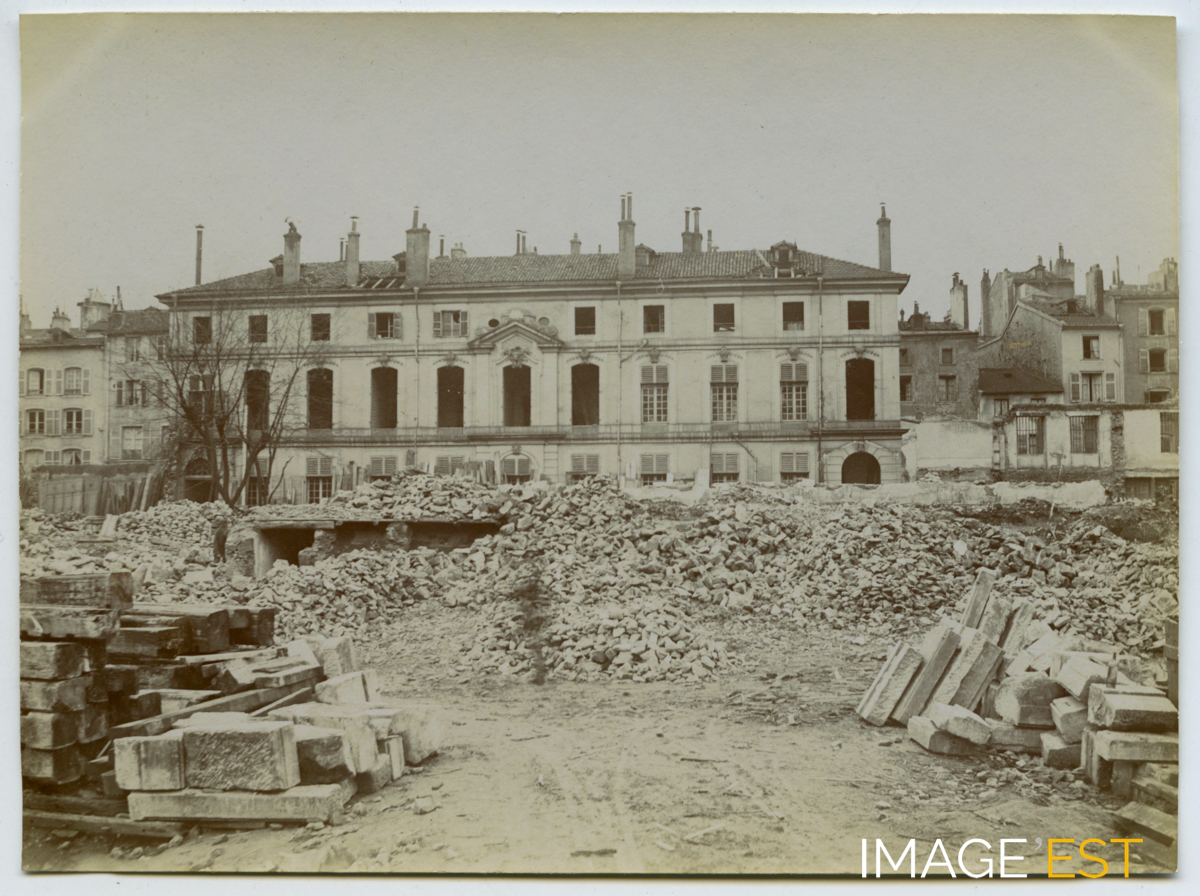 Chantier de démolition de l'ancien hôpital Saint-Julien situé près de l'hôtel de Ville, après sa démolition à Nancy (Meurthe-et-Moselle), le 10 avril 1900. Une mention manuscrite au verso de cette photographie précise : " 520 - 10 avril 1900 - Nancy 10 avril 1900 - Démolition de l'hôpital St Julien - (a) Le batiment d'administration ".