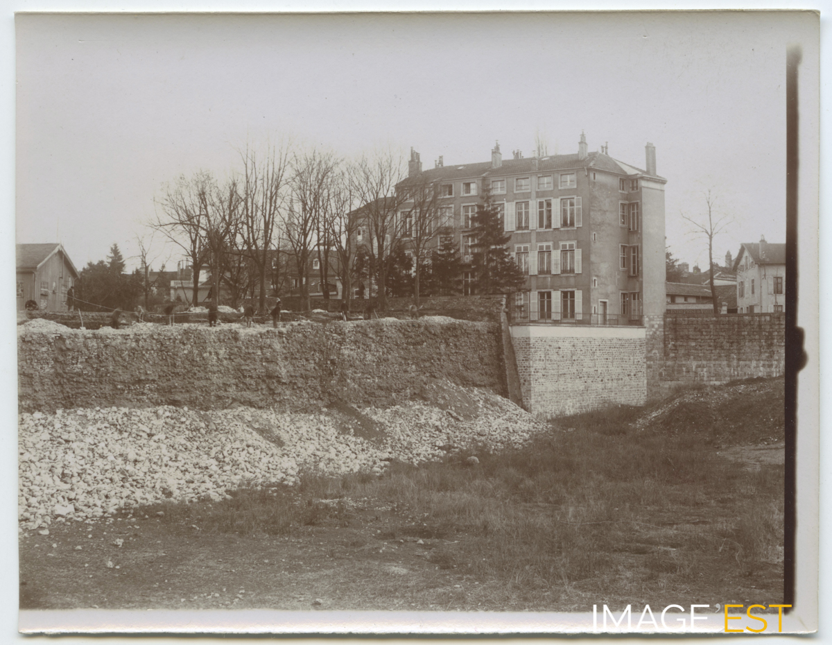 Dernières démolitions des remparts et restes de l'escarpe du flanc ouest de l'ancien réduit à Nancy (Meurthe-et-Moselle), le 28 janvier 1900. Une mention manuscrite au verso de cette photographie précise : " 402 - 28 janvier 1900 - Dernière démolition des remparts - Restes de l'escarpe du Réduit - 12 ". Une version plus claire de la photographie existe avec une mention manuscrite au verso : " 402 - 28 janvier 1900 - Flanc ouest du réduit en cours de démolition et maçonnerie plus nouvelle fermant l'emplacement de l'ancien fossé intérieur. - A droite le mur construit vers l'époque de la création du Cours pour soutenir la rue de la Craffe. - 1 ". Dans le prolongement de l'escarpe, on aperçoit une maçonnerie qui ferme l'emplacement de l'ancien fossé intérieur et, au pied de la maison, un mur perpendiculaire construit pour soutenir la rue de la Craffe. La maison présente sur la photographie existe encore de nos jours et se situe au 2 rue de la Craffe.