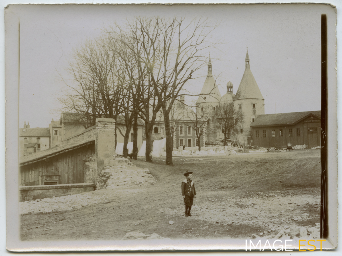 Terrasse de l'ancien réduit avec, à l'arrière-plan, les tours de la Craffe et l'ancien gymnase municipal à Nancy (Meurthe-et-Moselle), le 22 mars 1900. Une mention manuscrite au verso de cette photographie précise : " 409 - 22 mars 1900 - Les tours de la Craffe - Sur la terrasse du Réduit en A la jonction avec le flan du bastion depuis en partie détruit ". Le verso de la photographie présente aussi un croquis des lieux. Présence d'un enfant au premier plan de la photographie et des restes du flanc sud, en partie démoli, du bastion Le Marquis.