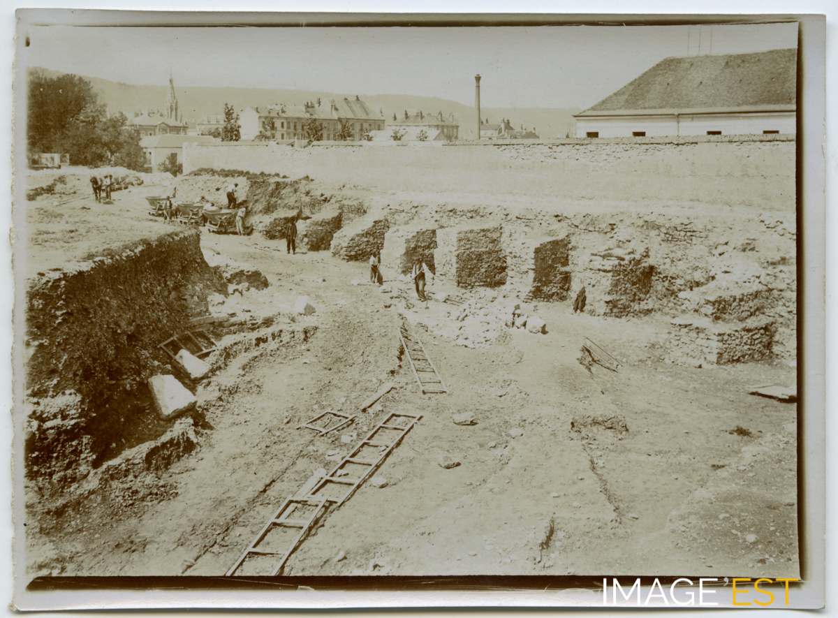 Chantier de démolition au niveau des contreforts de l'ancienne face du réduit situé derrière la porte de la Craffe à Nancy (Meurthe-et-Moselle), le 8 mai 1906. Une mention manuscrite au verso de cette photographie précise : " 653 - 8 mai 1906 - Les contreforts de l'ancienne face du réduit - à droite la caserne - au fond, clocher de St Fiacre ". À l'arrière-plan, on aperçoit le clocher de l'église Saint-Vincent, Saint-Fiacre et, derrière les contreforts, une partie du bâtiment de l'ancienne caserne du Génie. Présence d'ouvriers occupés à la démolition.