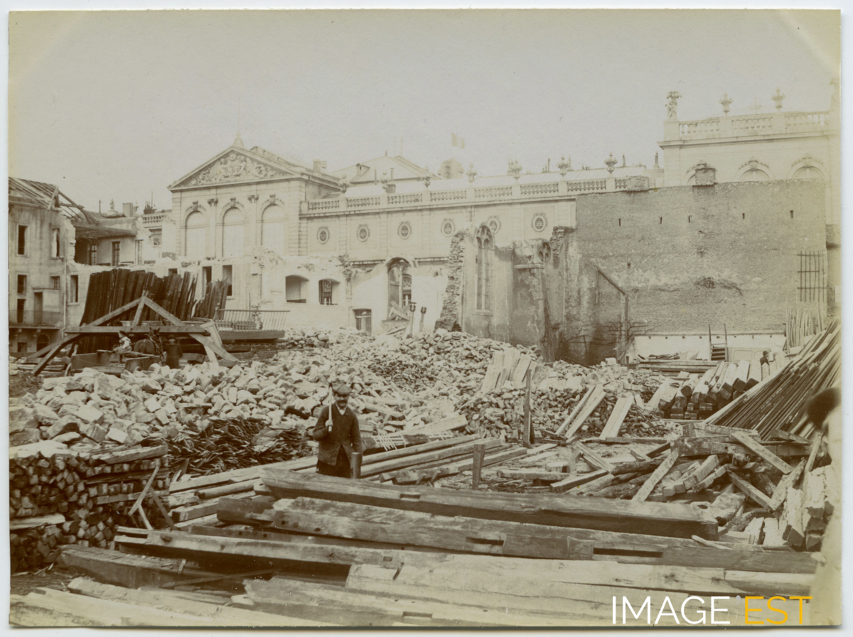 Chantier de démolition de l'ancienne chapelle Saint-Julien après sa démolition à Nancy (Meurthe-et-Moselle), le 10 avril 1900. Une mention manuscrite au verso de cette photographie précise : " 522 - 10 avril 1900 - (c) restes de la Chapelle St Julien - (à droite l'Hotel de ville, musée de peinture) ". Un ouvrier regarde en direction du photographe, au milieu de gravats et des poutres. À l'arrière-plan, les bâtiments de l'hôtel de ville, rue Pierre Fourier.