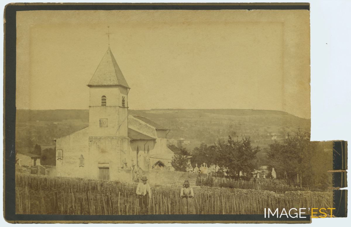 Ancienne église édifiée rue de la Justice à Maxéville (Meurthe-et-Moselle) probablement au début du XVe siècle à l'emplacement de l'actuel cimetière et détruite en 1889. Cet édifice, rappelle Léon Germain " était isolé au milieu des vignes à quelques centaines de mètres du village. Son éloignement indique qu'elle n'a pas été faite pour servir de paroisse. Elle a dû être une dépendance d'un château du Moyen Âge, dont elle était la chapelle castrale. La tour seule, dont l'entrée a été remaniée, est antique, et appartient au style roman. Une chapelle en cul-de-four y attenait certainement dans l'origine ; mais l'église étant devenue paroissiale, et la population s'augmentant, il fallut l'agrandir et transformer cette chapelle en une nef qui forme la première travée ; une seconde travée paraît être du XVe siècle, y fut ensuite ajoutée (...) La tour est placée, non dans l'axe de la nef, mais en face de la moitié de droite en entrant (épître). La porte, assez étroite, est surmontée d'un tympan rectangulaire... (L'Église de Maxéville (Canton de Nancy nord) / par Léon Germain, ... - Nancy : Sidot Frères, 1889). On trouvera d'autres informations historiques sur le site de l'Association Mémoire de Maxéville (http://www.memoiremaxeville.com). Ce tirage albuminé, contrecollé sur carton, est incomplet. Il manque la partie latérale droite qui a été probablement découpée pour être disposée à l'origine sous un cadre d'époque aux bordures dorées. Lors d'un démontage du cadre, trois morceaux manquants (voir FI-0683-0796) ont été retrouvés qui, assemblés, comportent la signature suivante " Chatelain ". Il s'agit dans ce cas d'une photographie prise par Céline Chatelain (1833-1908), photographe professionnelle, active sur Nancy de 1848 à 1898 et considérée comme la doyenne des photographes nancéiens. Cette vue a certainement été prise alors que son dernier atelier se trouvait au 24, rue de Boudonville à Nancy durant la période 1872-1898. Les trois morceaux complètent le muret de pierre à droite et la végétation. Ils ont été associés avec une retouche.