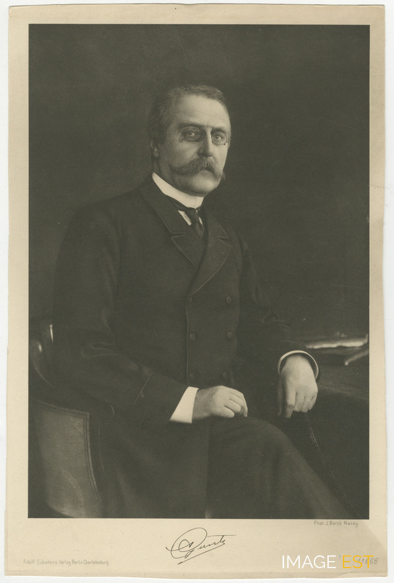 Portrait de Antoine Guntz (1859-1935), correspondant de l'Académie des sciences, professeur de chimie générale et troisième directeur de l'Institut chimique de Nancy à Nancy (Meurthe-et-Moselle) de 1909 à 1929. En marge de la photographie, la signature " Guntz ".