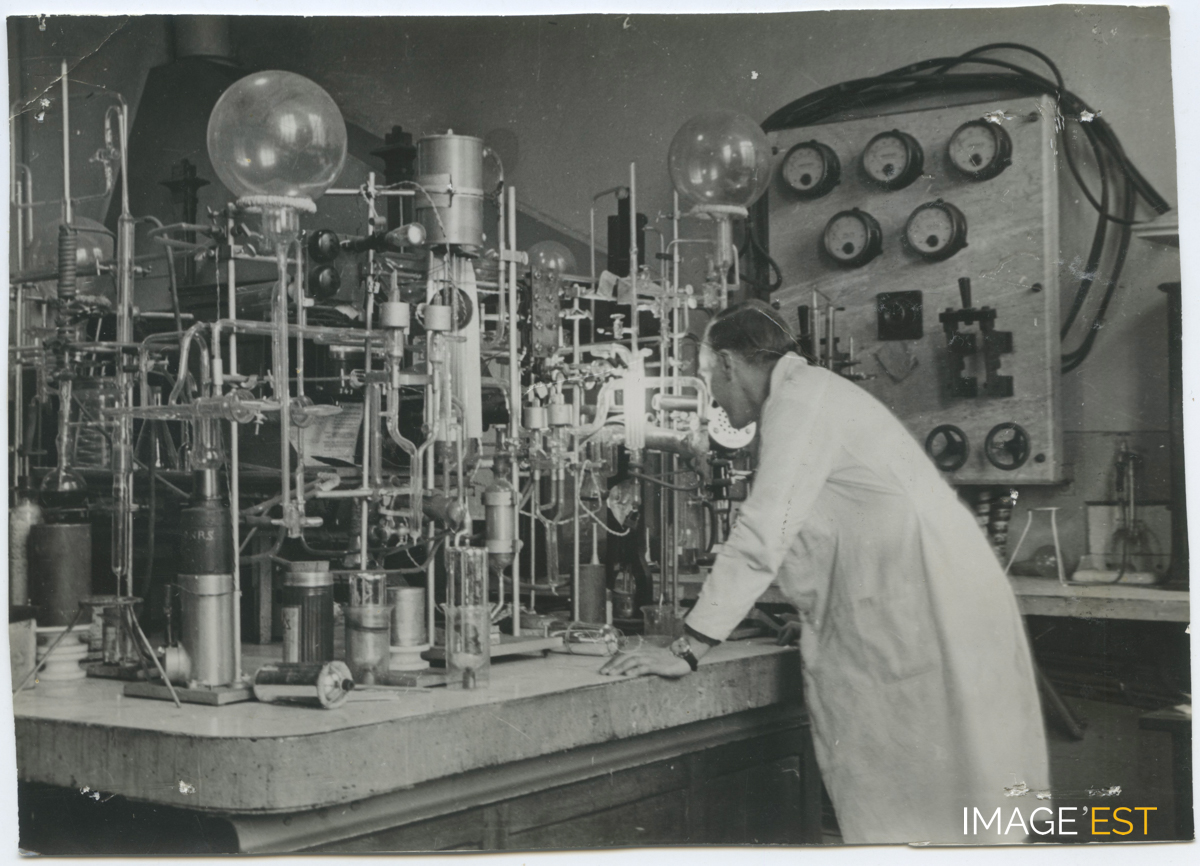 Le professseur Xavier Duval devant un appareil à filament de carbone de l'École nationale supérieure des industries chimiques (ENSIC) à Nancy (Meurthe-et-Moselle).