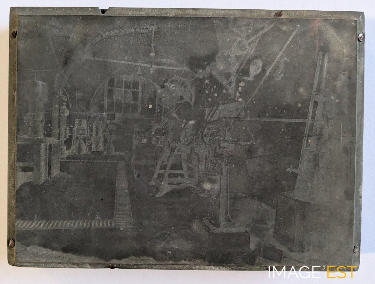Cliché typographique (similigravure pour reproduire mécaniquement une photogravue) pour impression une couleur (noir en général) sur presse typo. Il est composé d'un bloc de bois et d'une plaque métallique (en général du zinc) clouée sur le bois. La surface est constituée d'une trame très fine (petits points en relief) que l'on peut ressentir en passant un ongle ou discerner avec un compte-fil. La fabrication des clichés typographiques relève du travail du photograveur : la plaque métallique dont la surface est enduite d'une couche sensible est insolée au travers d'un négatif tramé de l'image à reproduire. Un dépouillement chimique gravera la plaque en une trame de points qui rendront, du blanc au noir, toutes les nuances de gris de la photographie à reproduire. Encrage et impression donnaient une reproduction non argentique pour la presse et l'édition avant la venue de l'offset. Les clichés étaient intégrés aux textes (caractères plomb). Ce cliché represente l'intérieur d'un atelier d'une des trois grandes écoles, l'École de brasserie et de malterie de Nancy (1893), l'Institut colonial et agricole de Nancy (1901) ou l'École de laiterie de Nancy (1905) à Nancy (Meurthe-et-Moselle).