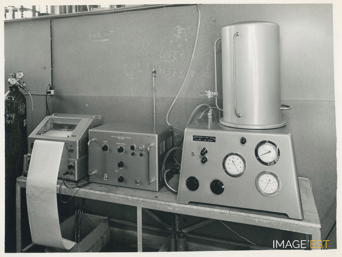 Appareils de mesure de l'École nationale supérieure des industries chimiques (ENSIC) à Nancy (Meurthe-et-Moselle). Cachet du photographe " Charles André Nancy n° 20 2951 ". Une mention manuscrite au verso précise " Labo Martus - Chromatographe en phase gazeuse ".