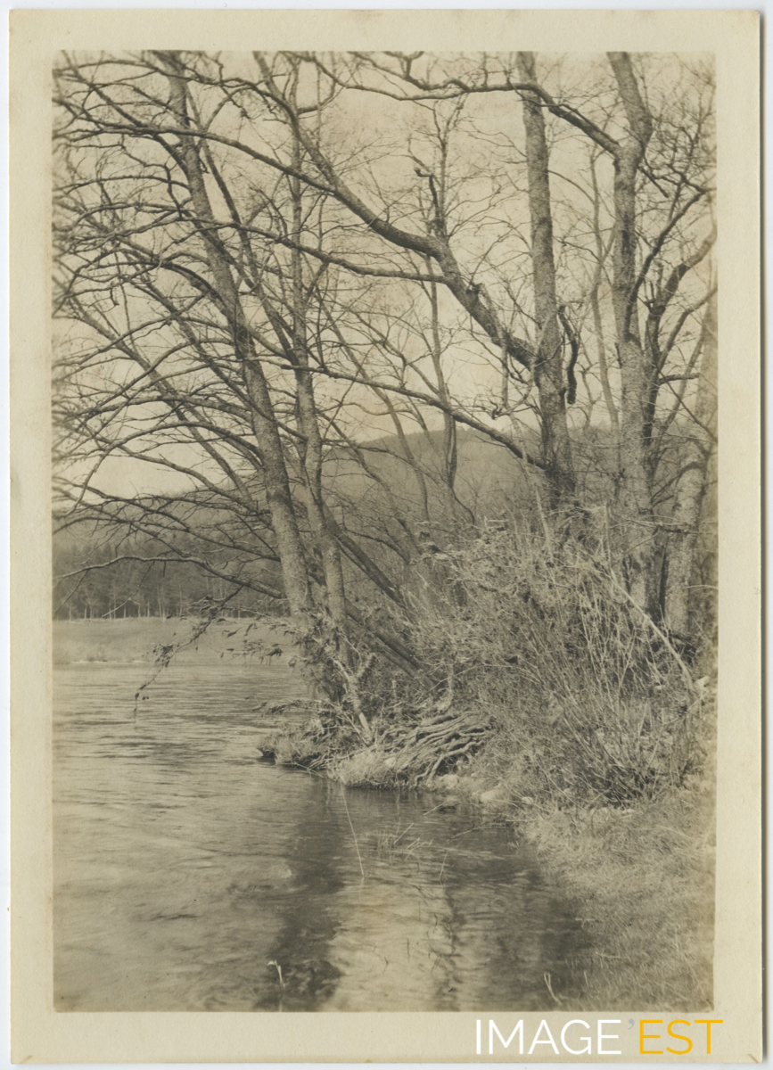 Arbres au bord de l'eau probablement dans le département des Vosges. Cette photographie est extraite d'un album en cuir repoussé comprenant un ensemble de 48 photographies (format 13 x 18 cm), noir et blanc, illustrant les loisirs et la vie d'une famille aisée probablement dans le département des Vosges à la fin du XIXe ou au début du XXe siècle.