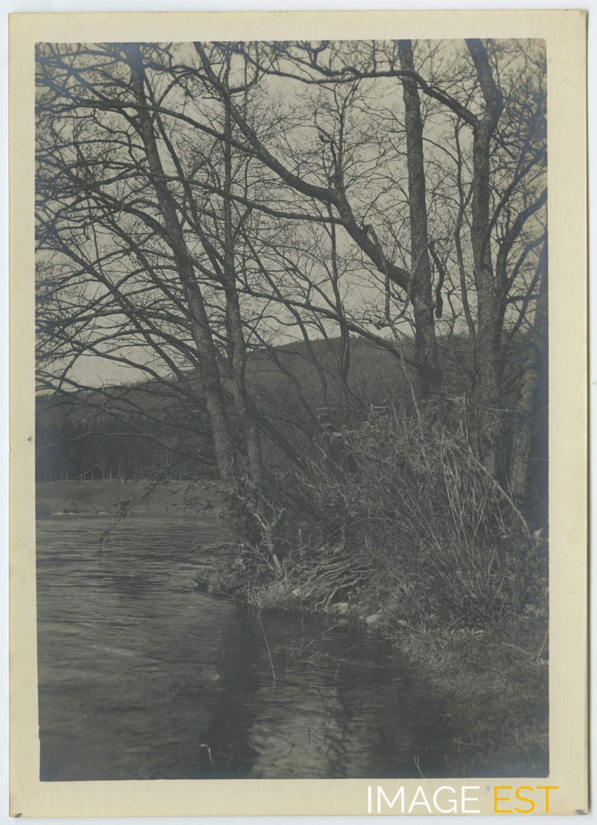 Arbres au bord de l'eau probablement dans le département des Vosges. Cette photographie est extraite d'un album en cuir repoussé comprenant un ensemble de 48 photographies (format 13 x 18 cm), noir et blanc, illustrant les loisirs et la vie d'une famille aisée probablement dans le département des Vosges à la fin du XIXe ou au début du XXe siècle.