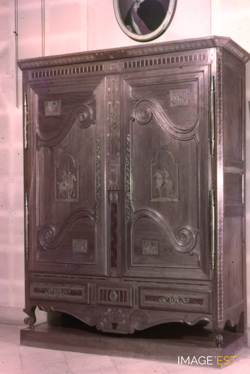 Armoire lorraine à deux portes sculptées et marquetés faisant partie des collections du Musée lorrain (Art et traditions populaires de Lorraine). En marge de la diapositive figure la mention : " 3 - " Armoire, Raville (M.-et-M.) vers 1814-1815.". Séries de diapositives sélectionnées et commentées par Jean Hurstel, directeur du Service éducatif des Musées de l'Académie de Nancy-Metz.