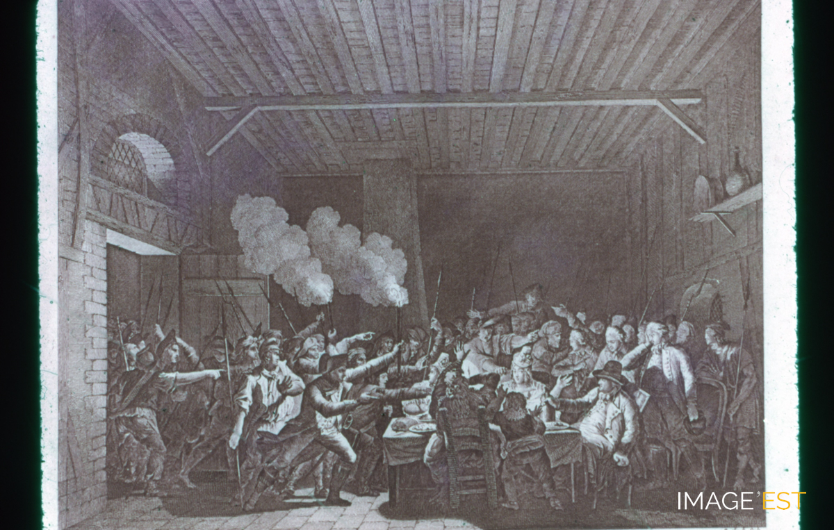 La Lorraine sous la Révolution. Estampe de Prieur (1759-1795), peintre-graveur. En marge de la diapositive figure la mention : " 5. L'arrestation de Louis XVI à Varennes, Meuse, par Prieur (22 juin 1791). ". Séries de diapositives sélectionnées et commentées par Jean Hurstel, directeur du Service éducatif des Musées de l'Académie de Nancy-Metz.