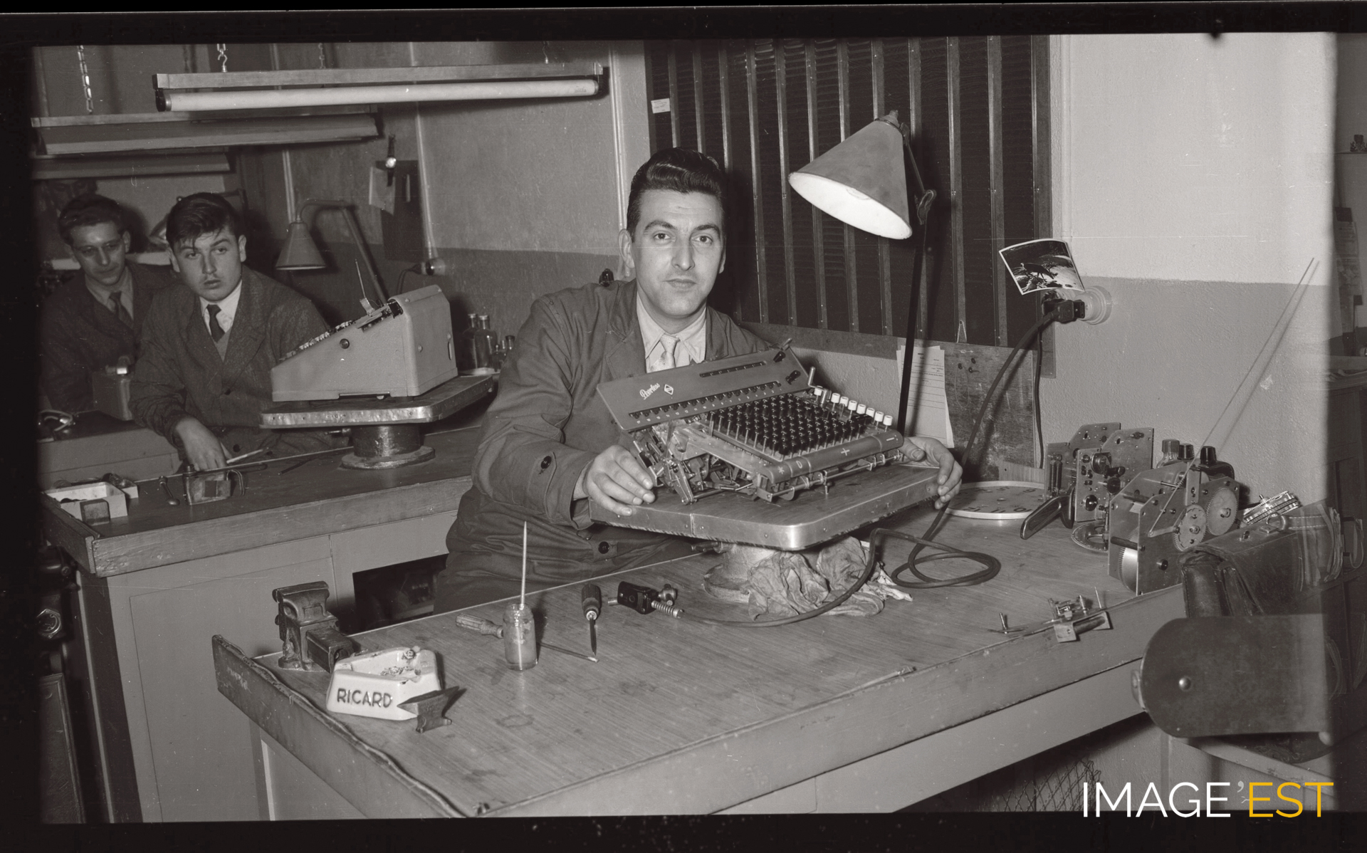 Intérieur d'un atelier de réparation de machines à écrire ou caisses enregistreuses de la société A. Rousseau, 26 rue Gambetta à Nancy (Meurthe-et-Moselle). Ce cliché fait partie d'une série de 7 photographies (pellicule négative souple enroulée, format 6 x 10 cm) illustrant des intérieurs d'ateliers et bureaux. Sur un étui cartonné dans lequel se trouvait ce rouleau, figurait la note manuscrite : " Ste?, A. Rousseau, 26 rue Gambetta - Service Bureau (fév. 57) ".