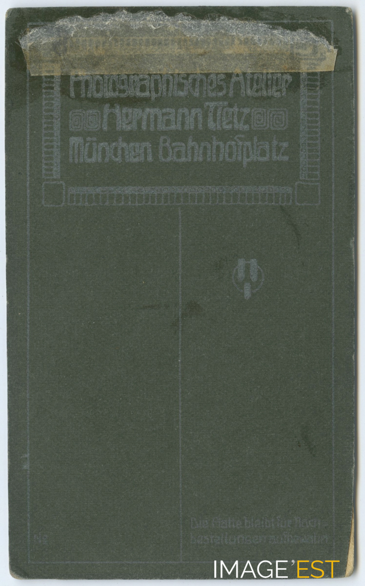 Cachet de l'atelier de photographie du photographe Hermann Tietz à Munich (Allemagne). " Photographisches Atelier Herman Tietz München Bahnoplatz ".
