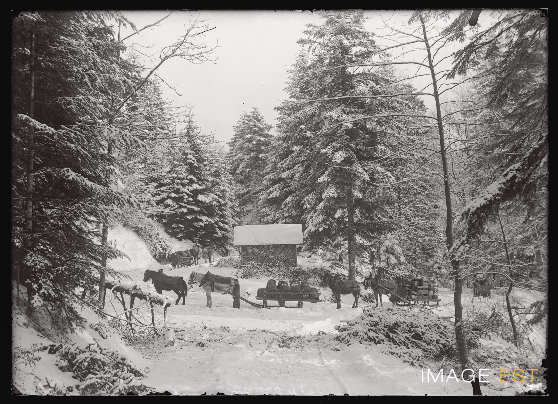 Attelages tractés par des chevaux transportant en plein hiver des caisses de bière et des fûts en bois destinés à la brasserie de la Gerbe d'Or au Val-d'Ajol (Vosges). La fabrication de la bière sur ce site commence en 1902 (http://www.valdajol.fr/wp-content/uploads/2020/08/200728_DOSSIER-CONCERTATION.pdf).