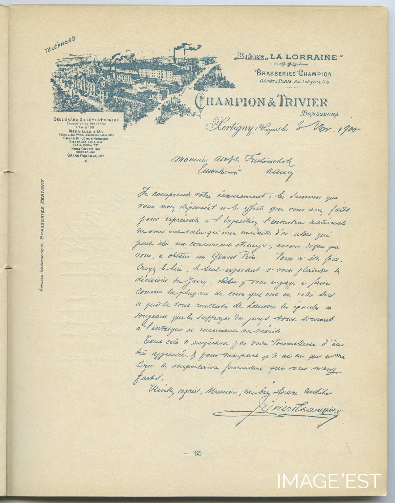 Lettre de la Brasserie Champion & Trivier à Xertigny (Vosges), datée du 3 novembre 1900 attestant des liens commerciaux qui unissaient cette entreprise à la tonnellerie nancéienne.