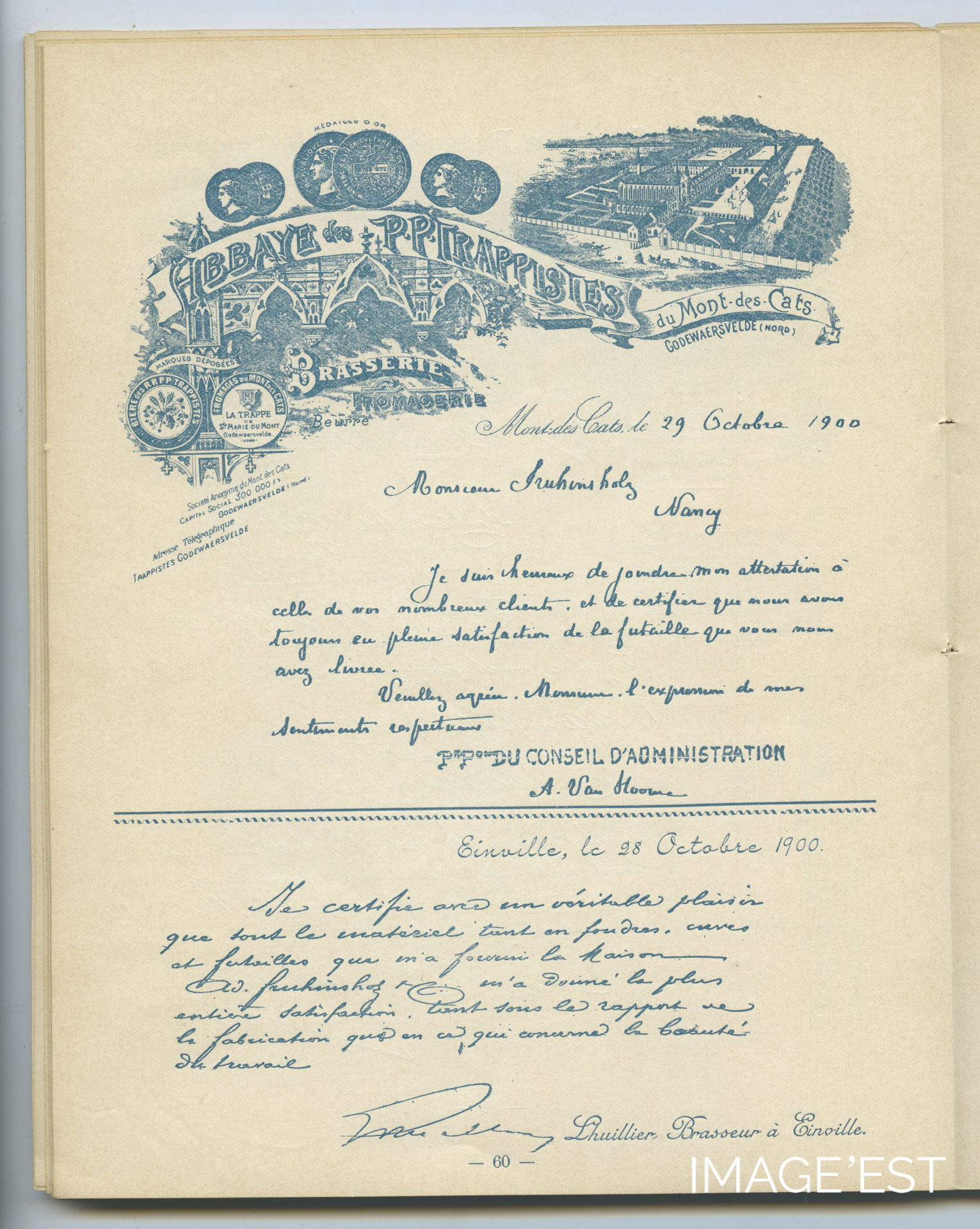 Lettre de la Maison Lhuillier, brasseur à Einville-au-Jard (Meurthe-et-Moselle,) datée du 28 octobre 1900 attestant des liens commerciaux qui unissaient cette entreprise à la tonnellerie nancéienne.