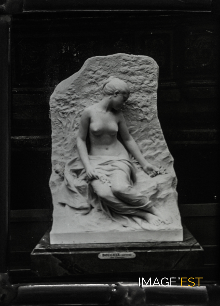 Version entière de la sculpture " Aux champ s" de Alfred Boucher (1850-1934). Elle a a figuré au Salon de la Société des artistes français en 1897 et a été plusieurs fois reproduite par l'artiste, complètement ou partiellement, notamment sous le nom " Le rêve ". (Extrait du vitrail n°3, ligne 9)