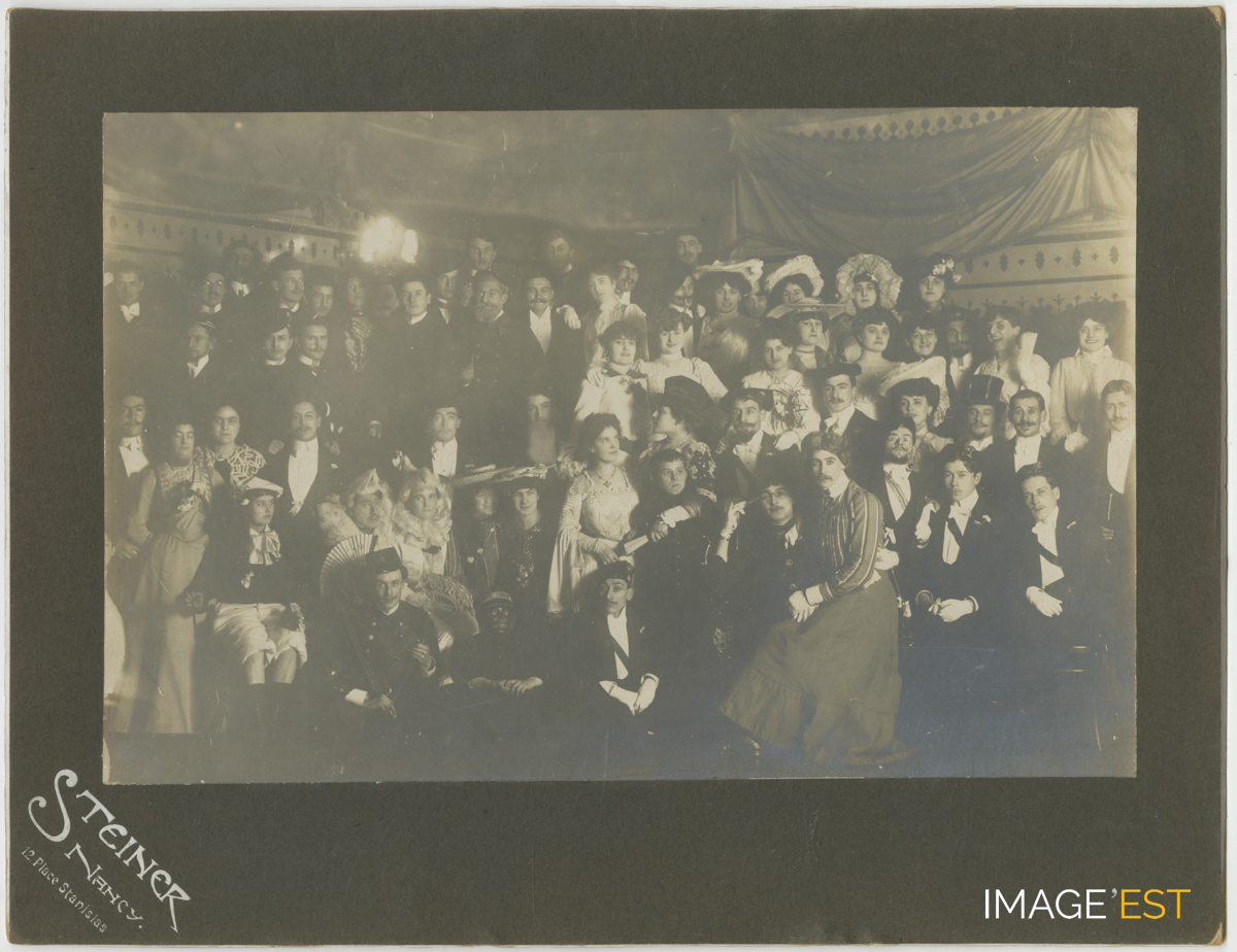 Groupe d'étudiants et d'étudiantes de l'Institut chimique de Nancy (Meurthe-et-Moselle) probablement lors d'un bal costumé. Au centre, une femme, de profil, porte un chapeau sur lequel on peut lire " Steiner, portraits d'art ".