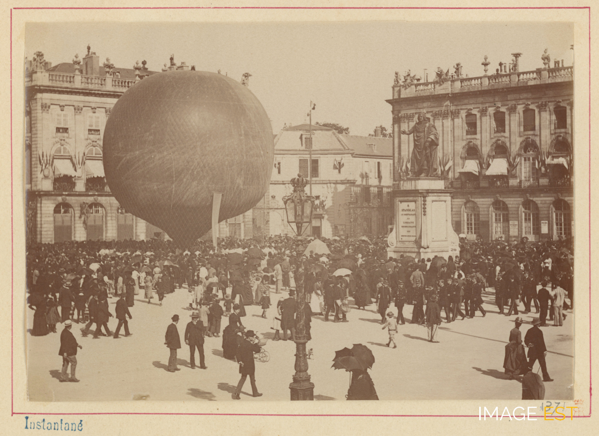Le 11 juin 1885, une démonstration aérostatique a lieu place Stanislas à Nancy (Meurthe-et-Moselle). Cette photographie est le plus ancien document iconographique retrouvé sur les premières expériences aérostatiques dans la cité ducale. Un article paru dans le journal " Le Progrès de l'Est " du 11 juin 1885, nous apporte d'autres précisions sur cette manifestation. On y apprend que le capitaine Paul Jovis, directeur de la Société d'expériences aérostatiques de Paris, vient à Nancy pour la " Fête aérostatique " en 1885. Après sa conférence sur l'histoire de l'aérostation, qu'il donne le mercredi 10 juin au Théâtre de la ville , il effectue un envol en balon le jeudi 11 juin. Cette vue pourrait correspondre au gonflement du ballon par des militaires peu avant le départ. L'article du journal " Le Progrès de l'Est " nous apprend qu'il s'agissait du ballon " l'Aérophile, cubant à 1 250 mètres commandé par le capitaine P. Jovis, accompagné des membres de la Société ". En marge de la photographie figurent la mention " Instantané ", le numéro " 1371 " et un monogramme à l'encre rouge, représentant deux " R " (dont un en miroir ) surmontés d'une couronne. Cette photographie pourrait être attribuée au photographe professionnel Félix Roy (1862-1930), membre du Photo-Club nancéien et de la Société lorraine de photographie dès 1896, actif de 1897 à 1920 environ. (Voir aussi : FI-0427-0264).