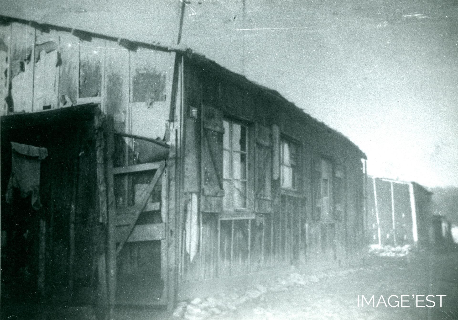 Baraque de l'usine de la Providence, rue de Lexy à Réhon (Meurthe-et-Moselle), louée à une famille italienne, en 1945. Elle est en bois, isolée par du carton goudronné.