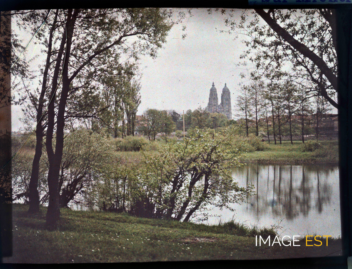 La Basilique de Saint-Nicolas-de-Port (Meurthe-et-Moselle) vue depuis une une rive de la Meurthe. Une mention manuscrite figure en marge de la plaque de verre autochrome : " Basilique de S Nicolas de Port ".