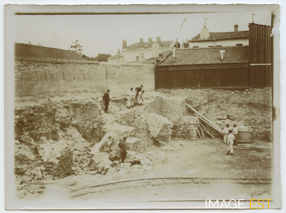 Démolition des contreforts de l'ancien réduit de La Reine à Nancy (Meurthe-et-Moselle), le 16 mai 1906. Une mention manuscrite au verso de cette photographie précise : " 666 - 16 mai 1906 - Destruction par une Compagnie du génie des contreforts de l'ancien réduit - 2 - 25 ". Présence des soldats du génie sur les contreforts en cours de démolition. Rails au premier plan pour le transport des gravats.