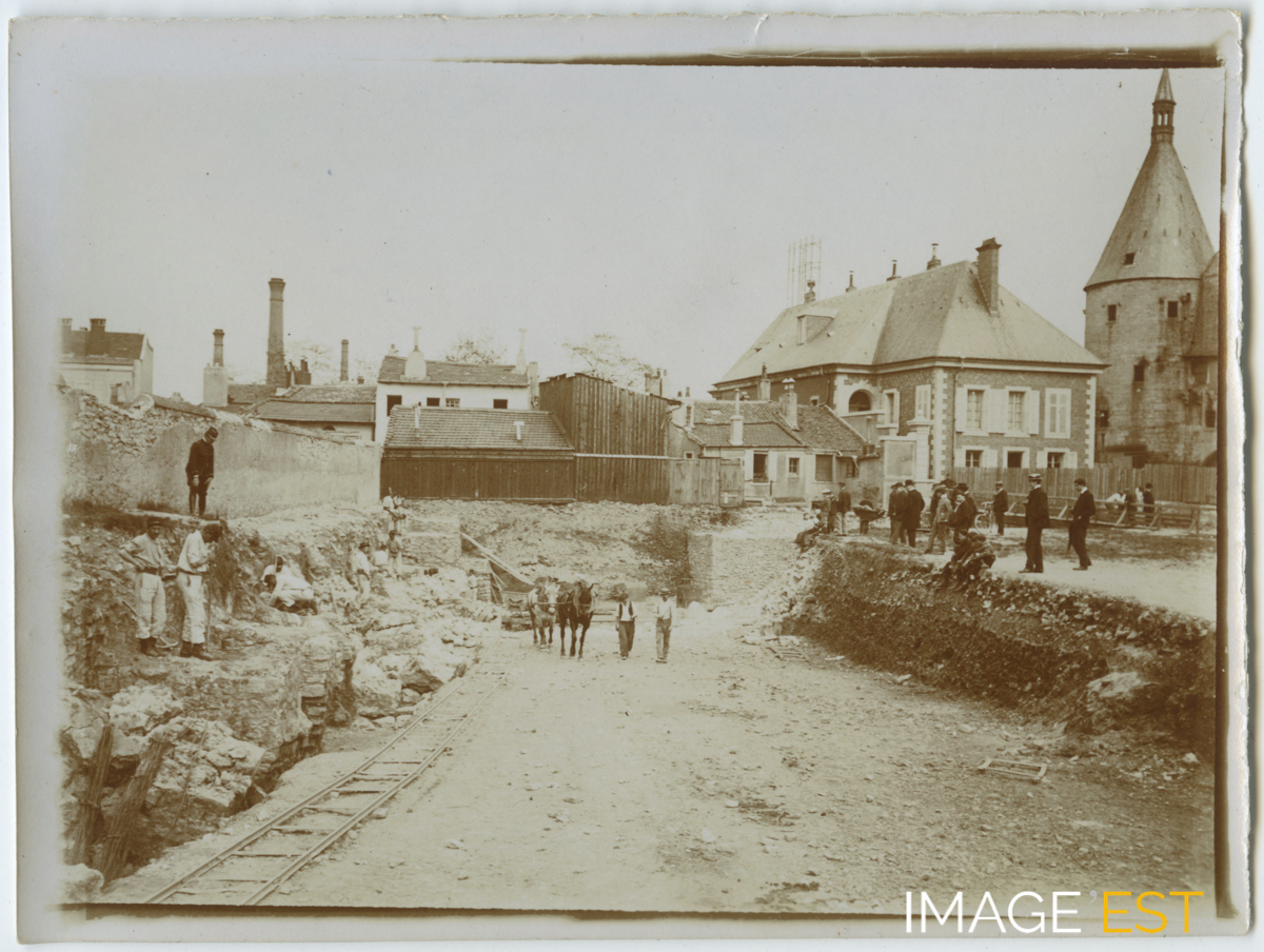 Soldats du Génie préparant les mines pour détruite les contreforts de la face Nord du bastion de La Reine à Nancy (Meurthe-et-Moselle), le 16 mai 1906. Une mention manuscrite au verso de cette photographie précise : " 665 - 16 mai 1906 - Mines préparées par Compagnie du génie (envoyée peu après à bout) pour détruire les contreforts de la face nord du bastion, formant la cour de la citadelle - 45 ". Présence des soldats du génie sur les contreforts en cours de démolition. Rails au premier plan pour le transport des gravats. À droite, une des tours de la porte de la Craffe.