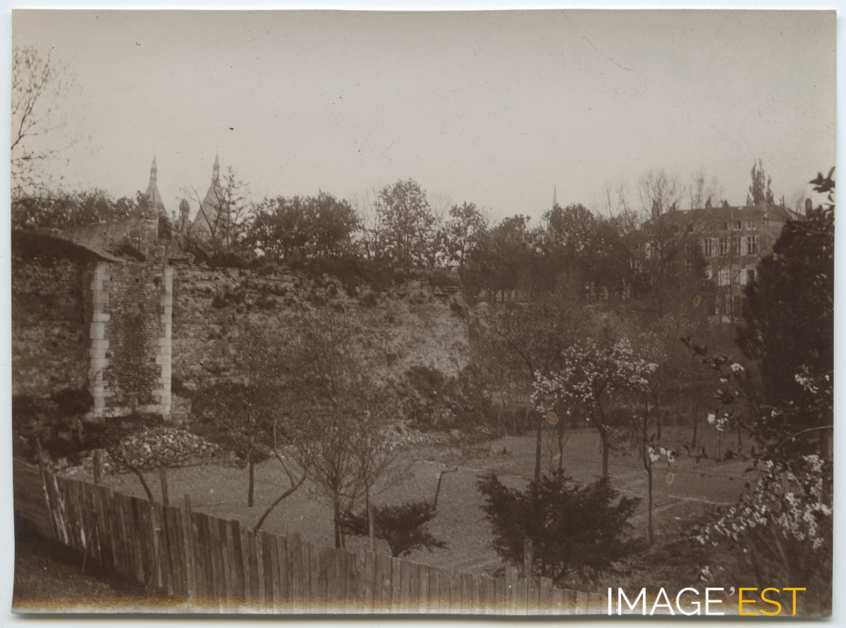 Partie du rempart de la face ouest du bastion Le Marquis, au niveau de l'orillon sud, et escarpe de l'ancien réduit à Nancy (Meurthe-et-Moselle), le 28 avril 1897. Une mention manuscrite au verso de cette photographie précise : " 91 - 28 avril 1897 - 18 ". À l'arrière-plan, on aperçoit le sommet des tours de la Craffe et une partie du clocher de la basilique Saint-Epvre. Sur la droite de la photographie, une grande bâtisse située rue de la Craffe et aujourd'hui intégrée à l'enceinte du collège de la Craffe.