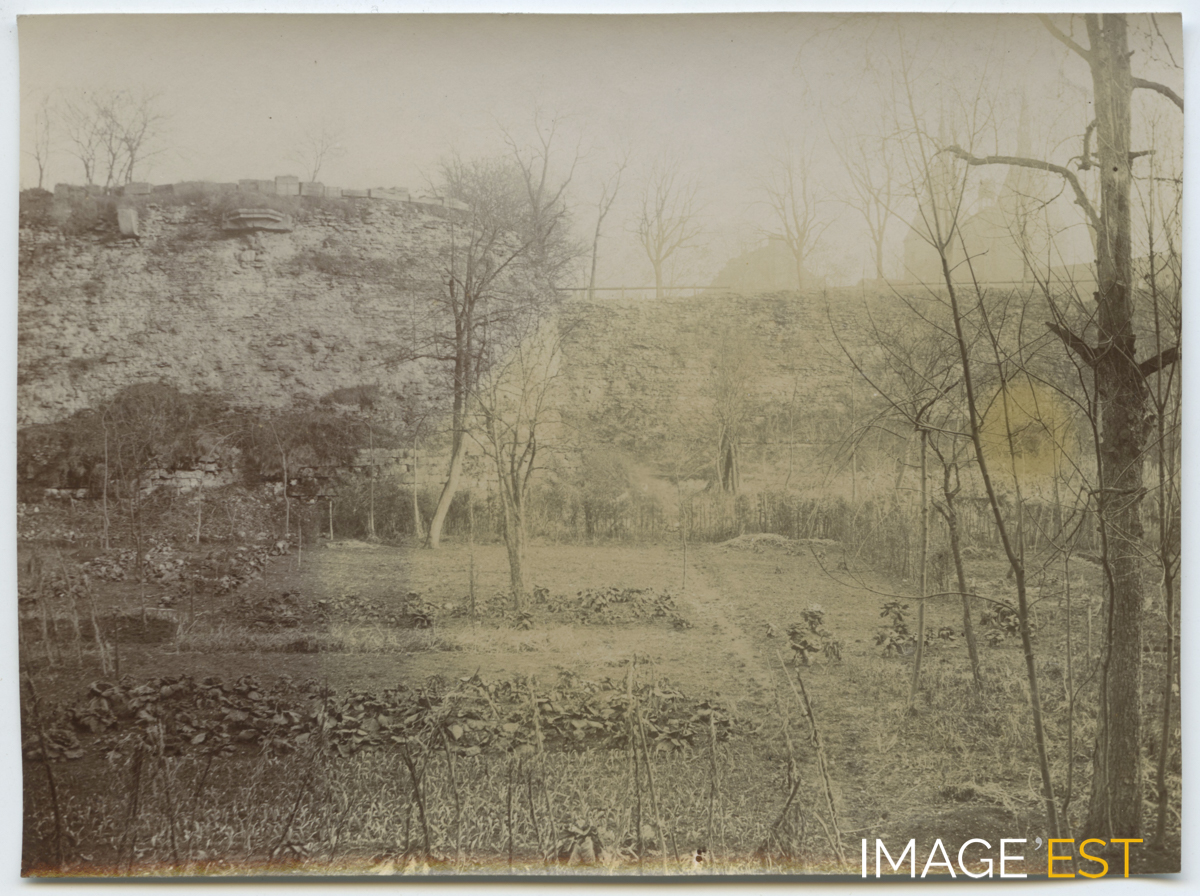 Vergers devant la face ouest du bastion Le Marquis du côté de l'orillon sud et escarpe du bastion de La Reine à Nancy (Meurthe-et-Moselle), le 6 janvier 1898. Une mention manuscrite au verso de cette photographie précise : " 189 - 6 janvier 1898 - Orillon du bastion Le Marquis vu du souterrain de la demi-lune - 13 - Lum. Janvier 98 ". Les tours de la Craffe sont visibles à l'arrière-plan.