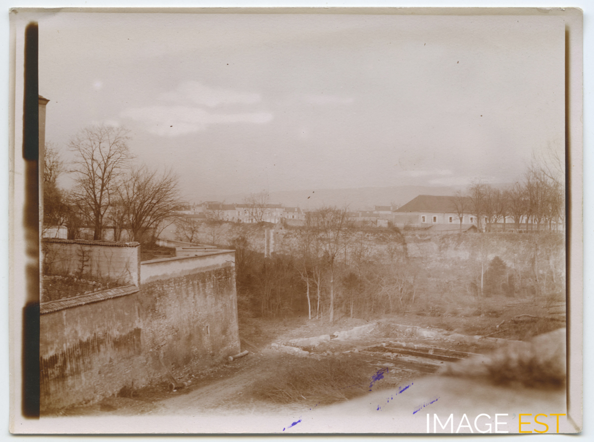 Vue de l'ancien lavoir depuis la rue de la Craffe, et de la face ouest côté orillon sud du bastion Le Marquis à Nancy (Meurthe-et-Moselle), le 6 janvier 1898. Une mention manuscrite au verso de cette photographie précise : " 190 - Nancy 6 janvier 1898 - Restes du bastion Le Marquis (emplacement de l'ancien lavoir - Épreuve matin presque toute une semaine exposée sur l'intérieur de la façade, avec un verre vert foncé sur la partie inférieure pour faire venir le lointain - 22 ". Sur la droite de la photographie à l'intérieur des remparts, bâtiment de l'ancienne caserne du Génie situé derrière la porte de la Citadelle et encore visible de nos jours.