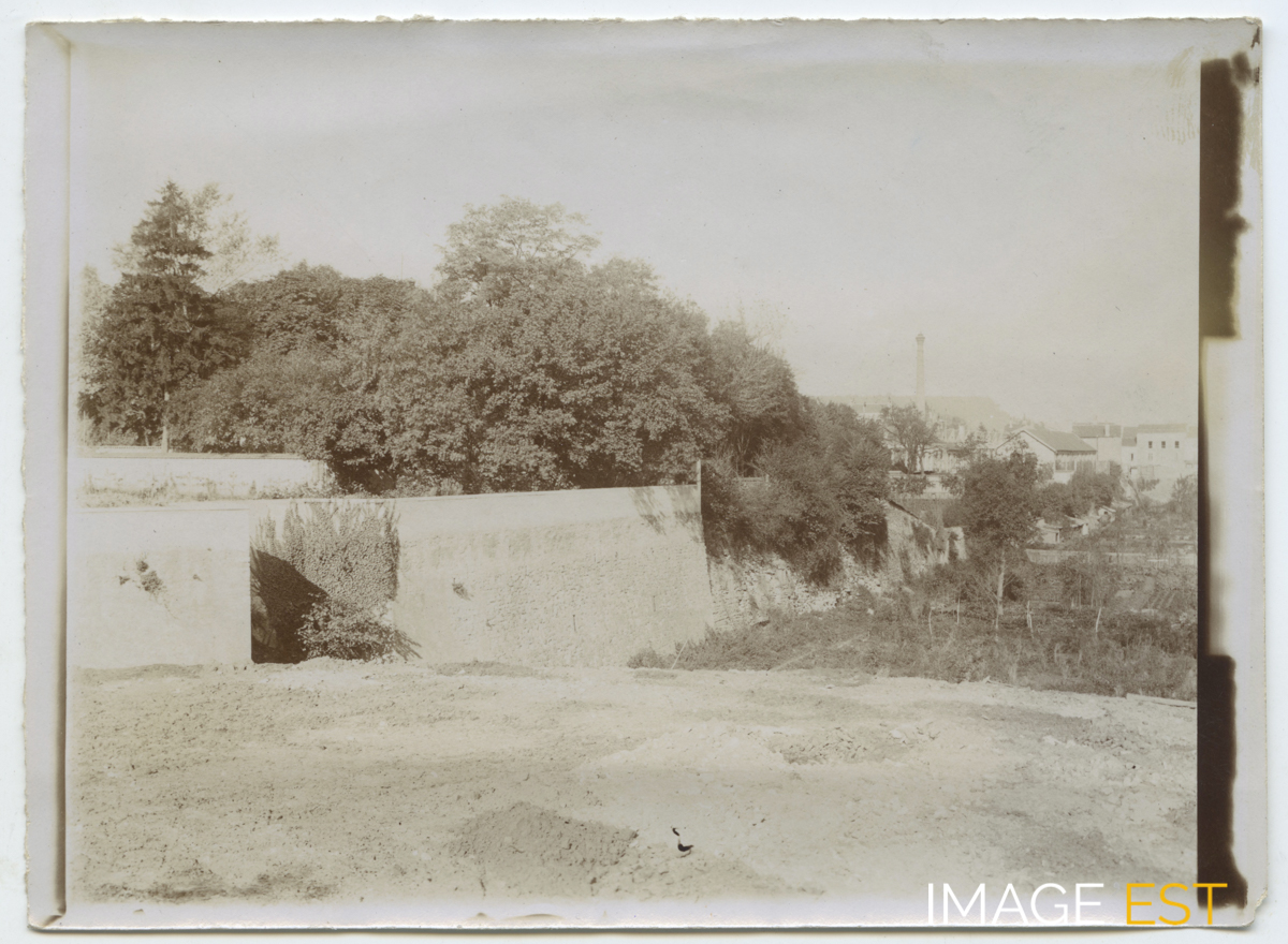 Fossés partiellement comblés du côté de la face ouest du bastion Le Marquis à Nancy (Meurthe-et-Moselle), le 20 août 1898. Une mention manuscrite au verso de cette photographie précise : " 264 - 20 8 1898 - Les fossés comblés au 1er plan - 23 ". À l'arrière-plan, on aperçoit la cheminée de l'usine Berger-Levrault.