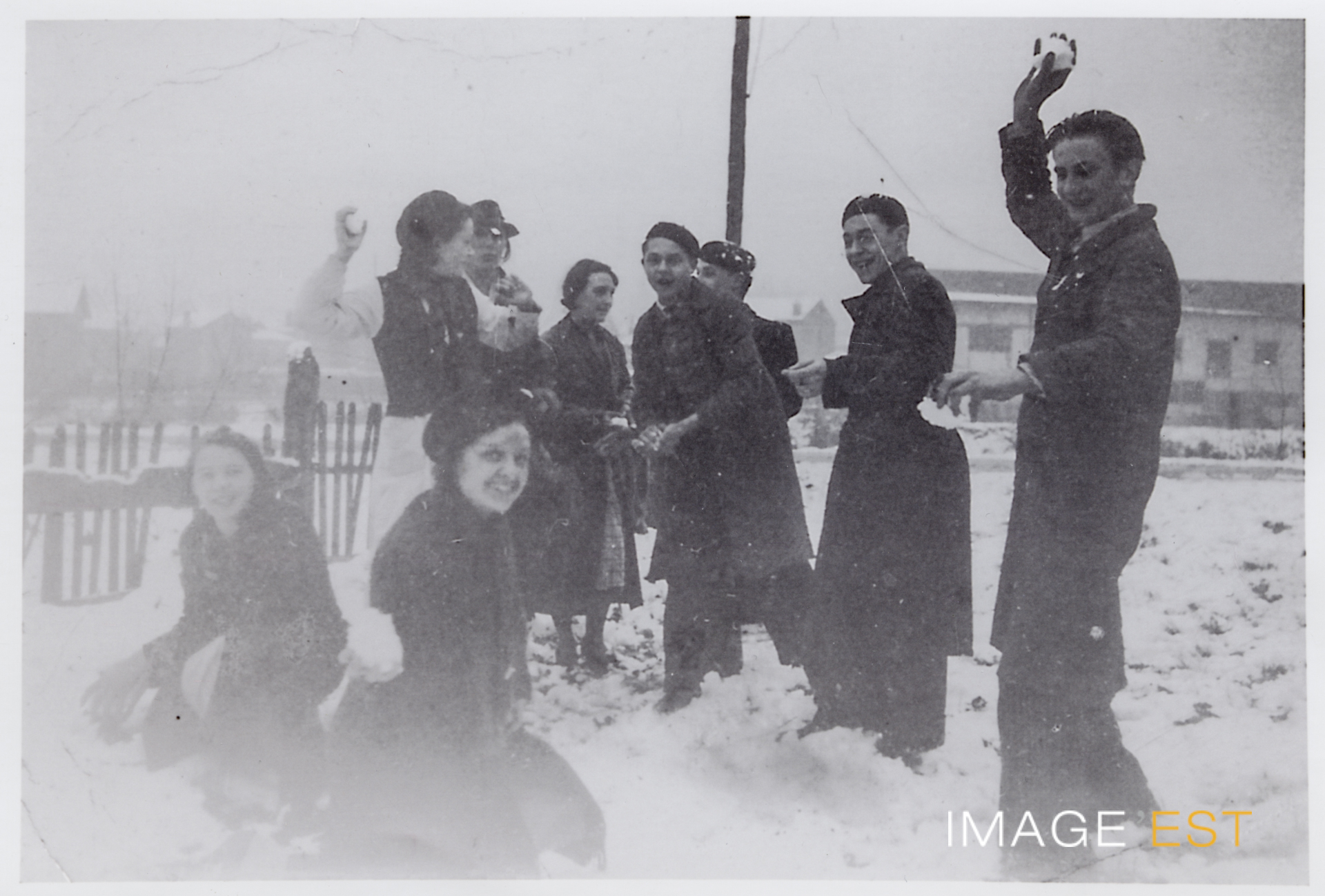 Bataille de boules de neige entre employés des " Fondoirs" à Maxéville (Meurthe-et-Moselle). Une mention manuscrite au dos du document précise : " Décembre 1937 - Bataille de boules de neige entre quelques employés des "Fondoirs" à proximité de l'usine. (Maman, Marguerite Roecker, en bas à gauche sur le cliché). Martial Coudoux "
