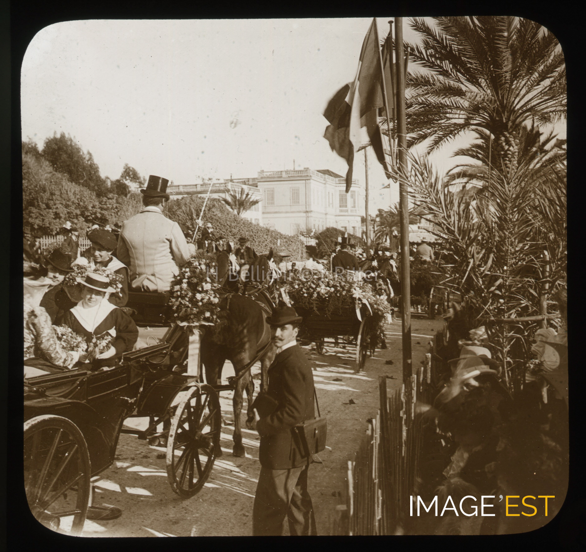 Défilé de chars de fleurs, à Cannes (Alpes-Maritimes). " Les batailles de fleurs, aujourd'hui appelés corsos fleuris, ont longtemps constitué des fêtes prisées des hivernants, festivités qui remontent à 1835, où l'on trouve trace d'une "fête des fleurs". Annoncées par des salves de coup de canon, elles se déroulent en mars-avril à la Belle Epoque. Des bannières de soie étaient confectionnées pour l'occasion, remises en récompense à ceux des candidats en lice, qui s'étaient montrés les plus méritants au cours du défilé. L'horticulture est une longue tradition régionale, et les marchés aux fleurs sont toujours présents sur la Côte d'Azur. " (Source : https://expos-historiques.cannes.com/r/183/batailles-de-fleurs-en-caleches/#:~:text=Les%20batailles%20de%20fleurs%2C%20aujourd,avril%20%C3%A0%20la%20Belle%20Epoque.) Un homme, se trouvant du côté de la route où défilent les chars, séparé de la foule assistant à l'évènement derrière une palissade, a des jumelles Bellieni en main et porte la sacoche contenant l'appareil. Il s'agit probablement de Léopold Poiré (1879-1917), photographe et assistant d'Henri Bellieni (1857-1938), en reportage photographique. Une mention manuscrite en marge de la plaque de verre précise : " Cannes. Bataille de fleurs ".