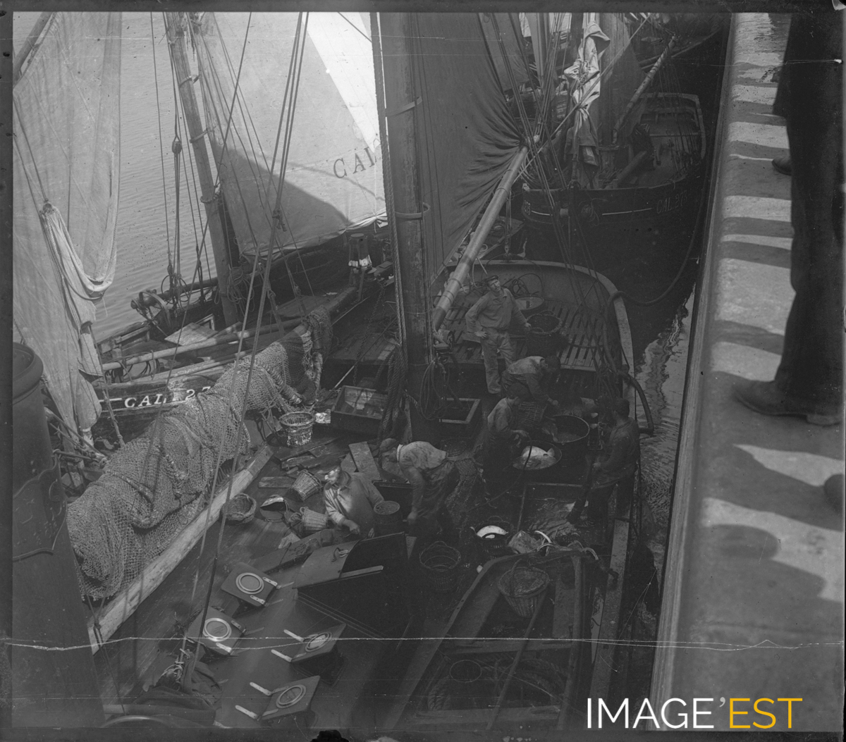 Bateau de pêche à quai. L'immatriculation sur la voile " CAL 27 " rattache ce bateau probablement à la ville de Calais.