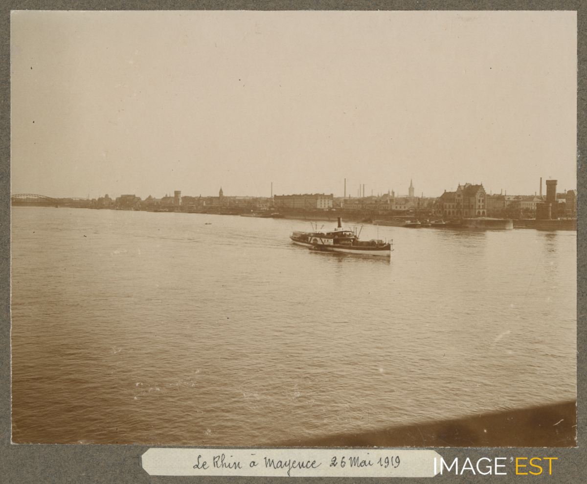 Bateau sur le Rhin à Mayence (Allemagne) le 26 mai 1919. Photographie extraite d'un album (format à l'italienne 40 x 31 cm), intitulé : " 1914 - 1919 " et ayant appartenu à M. Henri Boiget, militaire de la 47e compagnie automobile d'aérostation d'observation au cours de la Première Guerre mondiale. Cette compagnie de ballons et cerfs-volants a été créé à Saint-Cyr-l'École (Yvelines) le 8 août 1915 par dédoublement de la 30e compagnie, sous la forme d'un train de combat automobile selon les préconisations du commandant Jacques Théodore Saconney (1874-1935). Elle sera dissoute le 24 février 1919. Une mention manuscrite en marge précise : " Le Rhin à Mayence - 26 mai 1919 ".