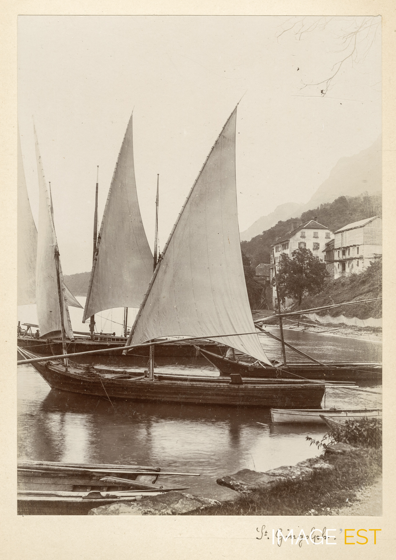 Bateaux à voiles sur les bords du lac Léman à Saint-Gingolph (Suisse). Cette photographie est extraite d'un album photographique intitulé, " Jura et Suisse J. D. 1894-1895 " comprenant 73 photographies contrecollées sur carton, prises par le lieutenant-colonel Joseph Jules Delarue (1839-1925), commandant le 50e régiment territorial d'infanterie de Nancy, photographe amateur et membre actif de la prestigieuse Société Lorraine de Photographie (fondée à Nancy en 1894) à laquelle il adhère en 1895 (Bulletin de la Société Lorraine de Photographie, n°3 septembre 1895).