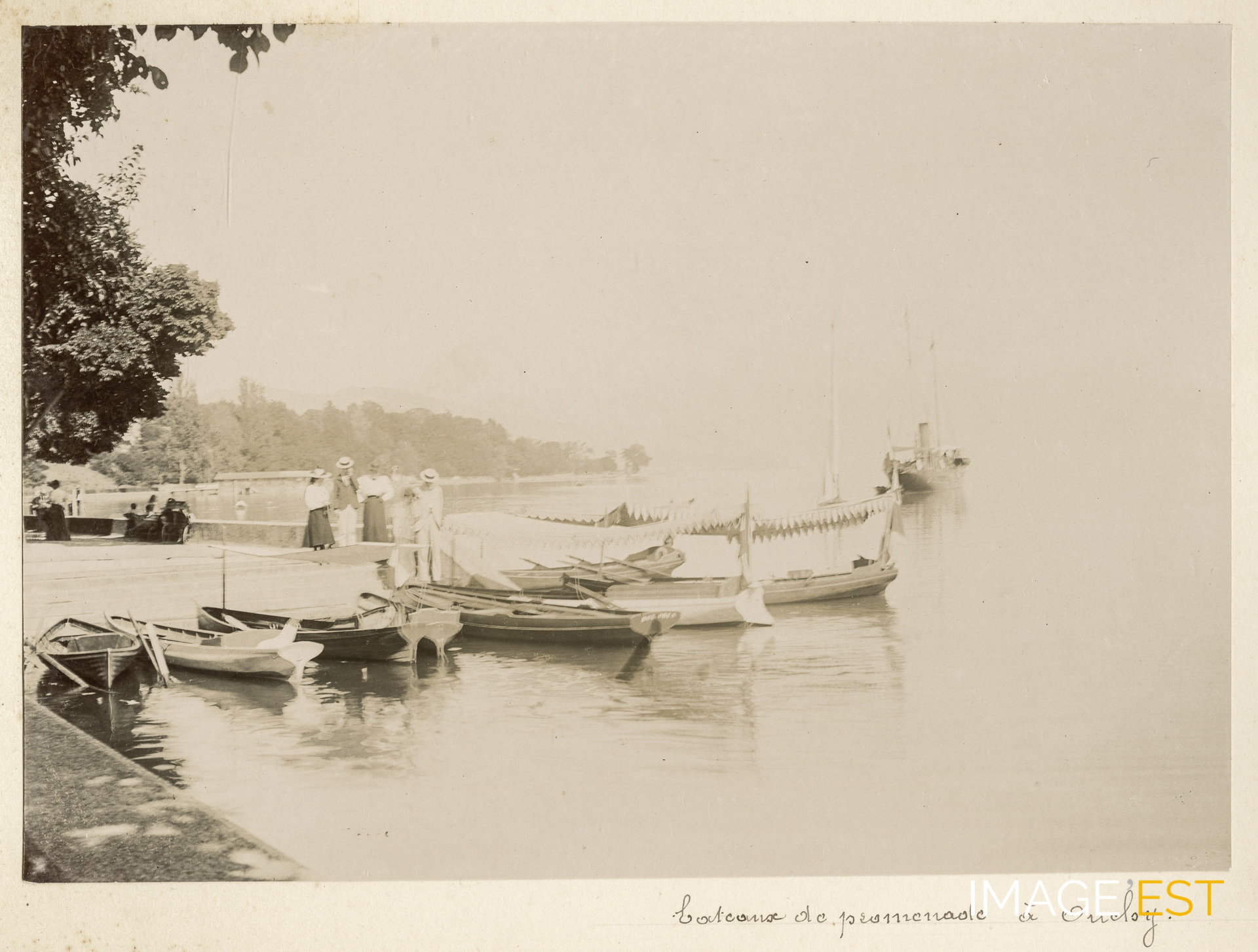Bateaux de promenade sur les bords du lac Léman à Ouchy, quartier et ancienne commune de Lausanne (Suisse). Cette photographie est extraite d'un album photographique intitulé, " Jura et Suisse J. D. 1894-1895 " comprenant 73 photographies contrecollées sur carton, prises par le lieutenant-colonel Joseph Jules Delarue (1839-1925), commandant le 50e régiment territorial d'infanterie de Nancy, photographe amateur et membre actif de la prestigieuse Société Lorraine de Photographie (fondée à Nancy en 1894) à laquelle il adhère en 1895 (Bulletin de la Société Lorraine de Photographie, n°3 septembre 1895).