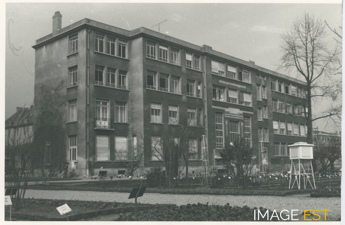 Bâtiment et jardin de l'Ensaia (École nationale supérieure d'agronomie et des industries alimentaires) rue Sainte-Catherine à Nancy (Meurthe-et-Moselle). L'histoire de cette institution remonte à la création successive de trois grandes écoles, l'École de brasserie et de malterie de Nancy (1893), l'Institut colonial et agricole de Nancy (1901) et l'École de laiterie de Nancy (1905). En 1948, l'Institut colonial et agricole de Nancy devient l'École nationale supérieure d'agronomie de Nancy (ENSA). En 1971, les trois grandes écoles (École de brasserie, École de laiterie et Ensa) fusionnent et donnent naissance à l'Ensaia. C'est en 1984 que l'Ensaia quitte ses locaux de la rue Sainte-Catherine à Nancy pour s'installer sur le plateau de Brabois (Source : https://ensaia.univ-lorraine.fr/fr/content/histoire-ensaia). Cette vue montre l'arrière du bâtiment de l'Institut agricole et colonial. C'est en 1928 qu'est construit ce bâtiment rue Sainte-Catherine qui sera inauguré en 1930.